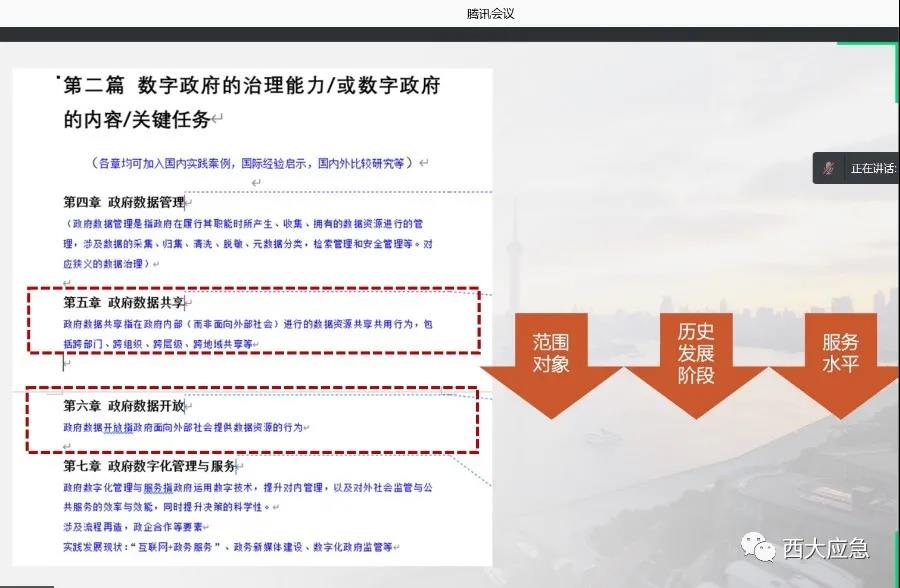 随后,付熙雯教授就第三章“数字政府的理论基础”的写作思路进行了分享,其认为一方面要梳理数字政府的理论渊源,例如整体性政府理论、协作性公共管理理论、网络治理理论等等。另一方面则是对数字政府理论的缘起和发展进行回顾。