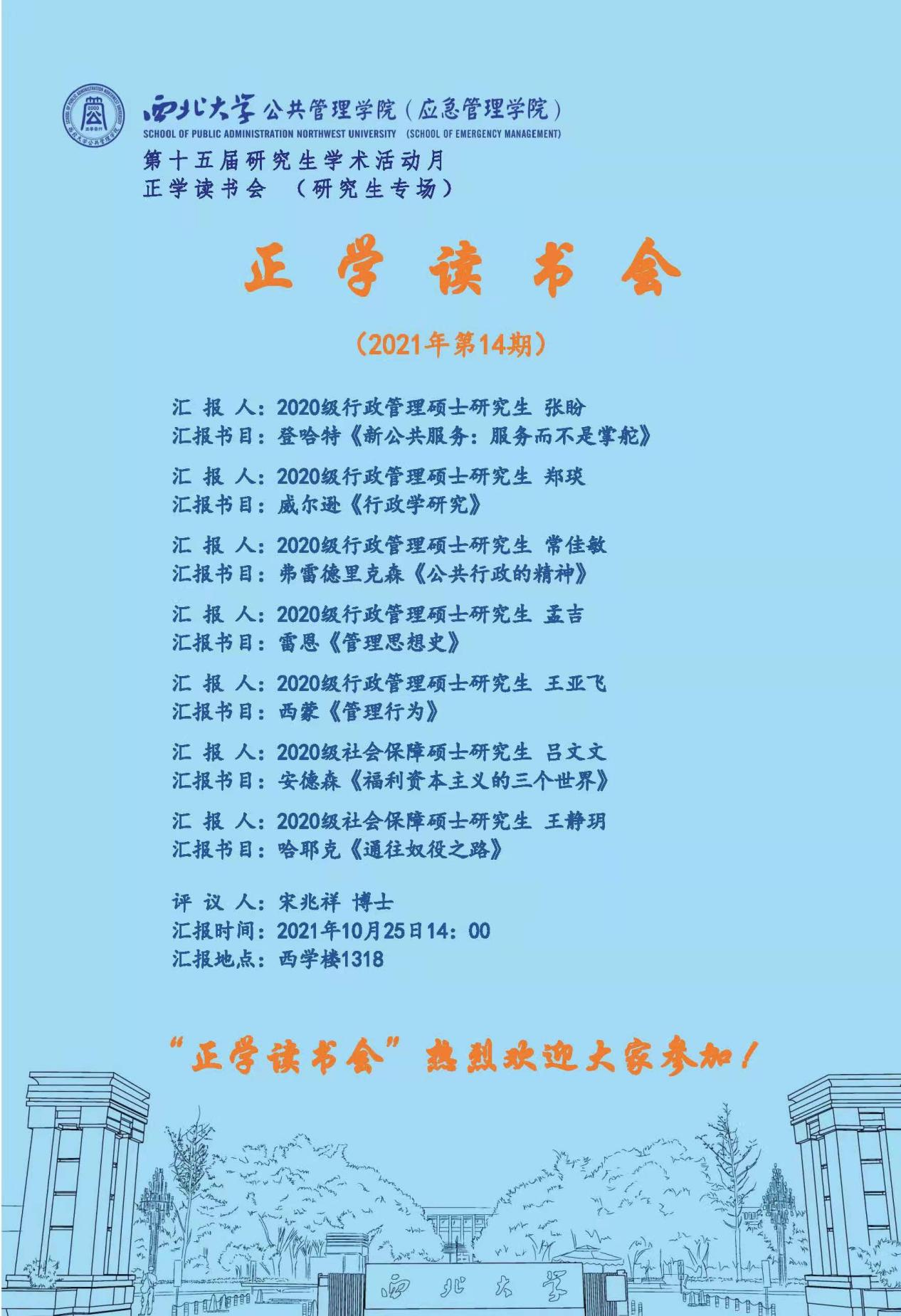 为进一步鼓励、引导学术研读学科学术经典,夯实学生的理论基础,提升学生的专业素养和科研能力,并营造积极向上的学习文化氛围,西北大学565net必赢于2021年10月25日下午14点在西学楼1318多媒体会议举办了第十四届“正学读书会”活动。本期正学读书会由2020级硕士研究生张盼、郑琰、常佳敏、孟吉、王亚飞、吕文文和王静玥同学分享他们感兴趣的专著,565net必赢博士研究生宋兆祥进行点评。