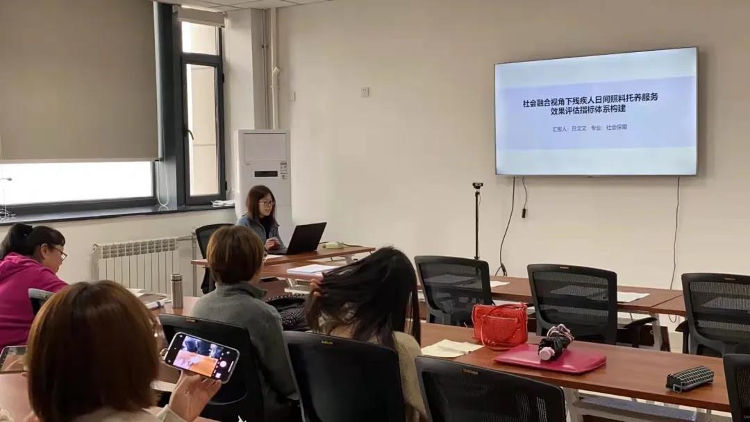 2020级社会保障专业研究生王静玥汇报的题目是《智障者及其监护人养老服务需求研究——以陕西省西安市为例》,她结合自己在导师课题组调研的收获对研究背景与研究内容展开了详细汇报,对智障者及其监护人的养老服务需求提出了自己的看法。