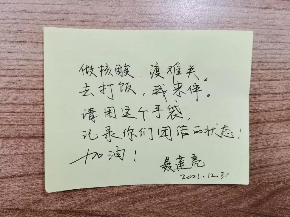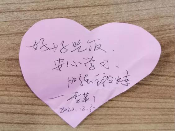 疫情下,同学们无法与家人团聚,这个时刻,公管院的老师们担任起了第二父母的角色。心理疏导、督促打卡、线上教育、采购生活用品,从生活到学习,无微不至地照顾起同学们。正如卡片上所说:“好好吃饭,安心学习,加强锻炼。”简单的话语蕴含着教师们对学生们的关心。