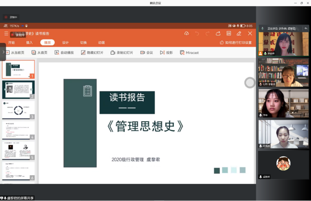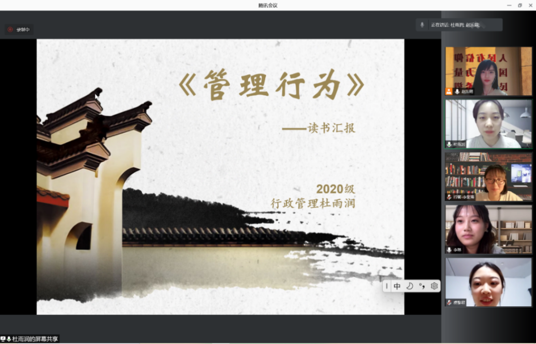 2022年4月4日晚,我院举办了本学期第3期研究生读书分享会。2020级行政管理专业杜雨润、赵乐萌、虞黎君、李琳、李紫瑶进行了汇报,王国桥博士作为评议人。