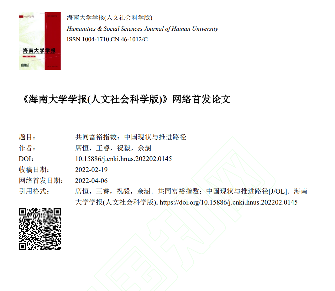 2020级博士生王睿、2021级博士生余澍与导师席恒教授、祝毅老师合作的论文《共同富裕指数:中国现状与推进路径》,在《海南大学学报(人文社会科学版)》网络首发。