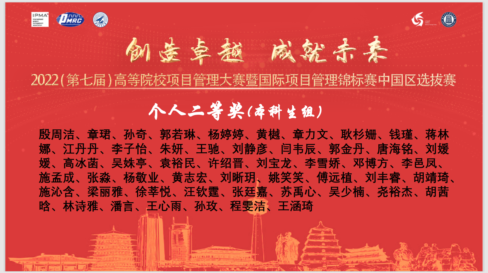 我院公共政策与管理系闫杰老师和伍勇老师指导的参赛队,获得2022年第七届高等院校全国项目管理大赛团队三等奖,个人二等奖一项,个人三等奖两项。