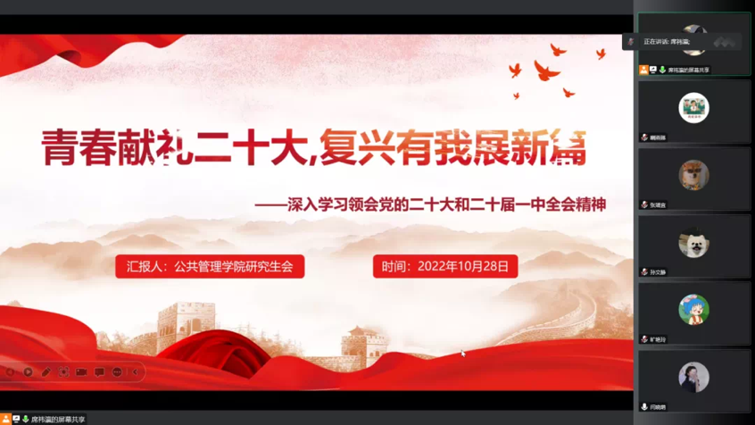 来自学院各专业的学生代表结合自身所学,从行政管理、档案学科、心理学等不同学科以及生态文明、文化建设、法治建设等不同领域带领同学们研读了党的二十大报告全文,细梳理论脉络,深入领会了报告精神,分享了党的二十大报告的不同层面的内容。活动结束后,各班级成员聚焦主责主业,从自身学科视角分享交流了自身的学习感悟。在系列活动中,各班级成员通过学生代表的精彩讲述深刻领悟了党的二十大报告主旨内容及核心精神,深感责任重大、使命在肩。今后同学们将不断增长知识本领,勇于突破创新,自觉把个人学术追求同国家和民族发展紧紧联系在一起,勇担时代之任,为中华民族伟大复兴而努力学习,艰苦奋斗。