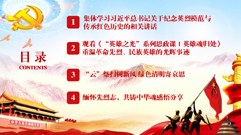 又是一年芳草绿,又是一年清明时,踏青思故,追忆英烈。“天地英雄气,千秋尚凛然。”英雄先烈是我们民族的脊梁。习近平总书记曾在多个场合,缅怀英雄先烈,致敬英烈精神。习近平总书记的话语铿锵有力,掷地有声。翻开历史的篇章,无数中华儿女为争取民族独立、实现国家富强前赴后继,他们艰难求索、以身报国,托举起今日中国辉煌成就的不竭动力。在英烈们身上,集中体现的爱国情怀和民族气节,是青年一代不忘初心、接续奋斗的动力源泉,需要我们用实际行动,把爱国情、强国志、报国行自觉融入到工作实践中,循着英雄的足迹走下去,承着英雄的事业干下去。作为新时代青年,我们更应当珍惜今天来之不易的幸福生活,继承先烈遗志、传承红色基因、弘扬优良传统。