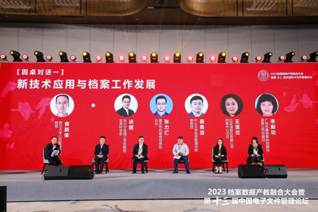 14日下午,2023年档案数据产教融合大会暨第十三届电子文件管理论坛分论坛三召开,该论坛主题为“档案数据产业发展”,来自政府单位、高校、企业的上百位专家代表参与论坛,共享、共商、共讨、共研全球数字化转型与数字中国战略全面推进大背景下我国档案数据产业发展的理论方向与实践路径。论坛设置圆桌对话环节,其中圆桌对话一的议题为“新技术应用与档案工作发展”,由我院公共信息资源管理系教授黄新荣主持,浙大宁波理工学院教授、首席科学家谈建,重庆市档案馆信息处处长张力仁,中山大学信息管理学院副教授聂勇浩,比亚迪股份有限公司档案中心主任王亚兰,广州利康信息科技股份有限公司总顾问李新功等嘉宾围绕议题展开一系列讨论。黄新荣教授作为主持人以“新技术在档案工作中的最佳应用场景”以及“大数据时代下档案工作发展亟须解决的技术问题”作为议点推进对话进行,促进圆桌对话的圆满完成。