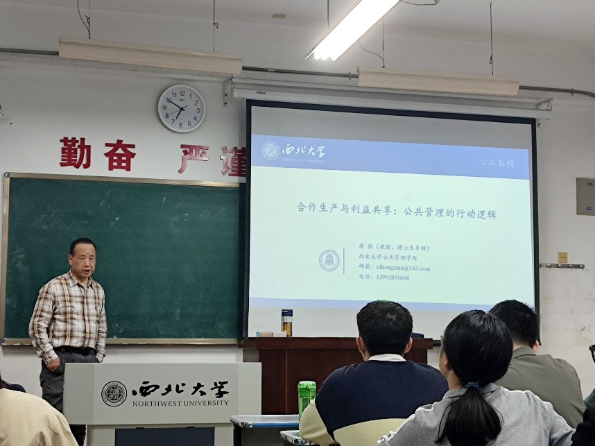 2023年11月1日晚,西北大学565net必赢席恒教授在长安校区教学一号楼1209教室为我院2023级全体硕士研究生作了题为“公共管理的行动逻辑”的专题讲座。
