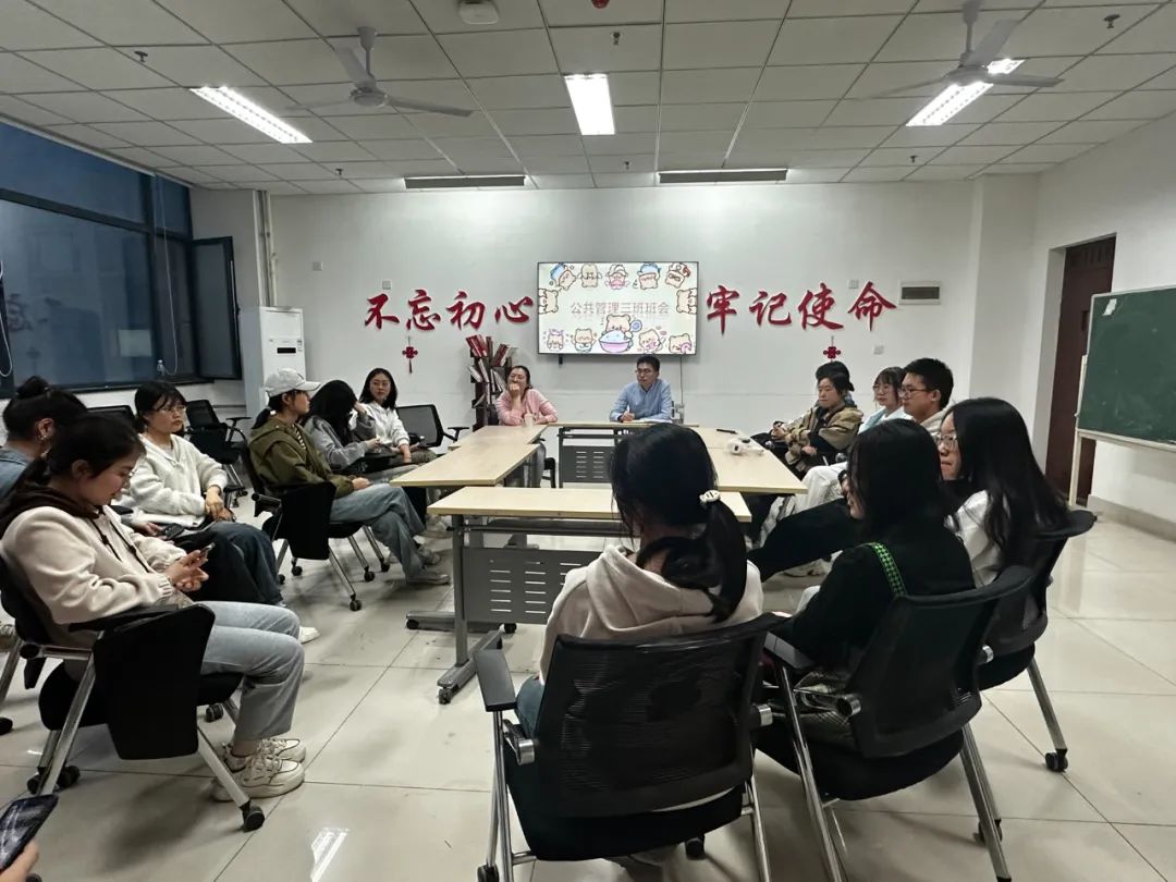 在新学期开始之际,为了帮助学院本科新生更好地适应大学生活,及时回应同学们在学习生活上的困惑,引导2023级公管新生坚定理想信念、脚踏实地,立志做“有理想、敢担当、能吃苦、肯奋斗”的新时代好青年。2024年3月29日,2023级公管2班、公管3班分别召开师生座谈会,会议由辅导员苏林主持,校友夏梦莹和班级同学一同参加。