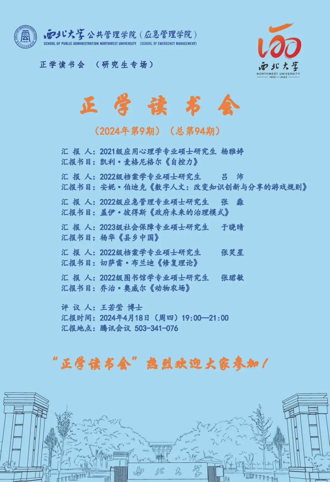 2024年4月18日晚,我院于腾讯会议线上举办了2024年第9期正学读书会。2021级应用心理学专业硕士研究生杨雅婷、2022级档案学专业硕士研究生吕沛、张笑星,2022级应急管理专业硕士研究生张淼、2023级社会保障专业硕士研究生于晓晴、2022级图书馆学专业硕士研究生张珺敏分别作为主讲人进行读书汇报,565net必赢2023级博士研究生王若莹担任评议人,部分研究生旁听了此次报告会。