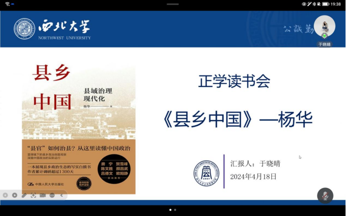 2023级社会保障专业硕士研究生于晓晴分享的书目是杨华的《县乡中国》,她从作者简介、内容概述和读后思考三个部分展开汇报。首先,她简要介绍了作者的基本情况及取得的学术成就。其次,她对该书的内容进行了导读,对全书的四个部分即县域治理体系、县域治理能力、县域治理自主空间、基层干部的发展和激励进行简要介绍。另外,她还总结到,该书的特点是接地气、通人情,有很强的阅读性。最后,她分享了自己的读书感悟,她认为该书作者深入浅出地分析了县乡治理的底层逻辑、政府的实际运行方式,读来通俗易懂,既不枯燥,又收获了满满的干货。