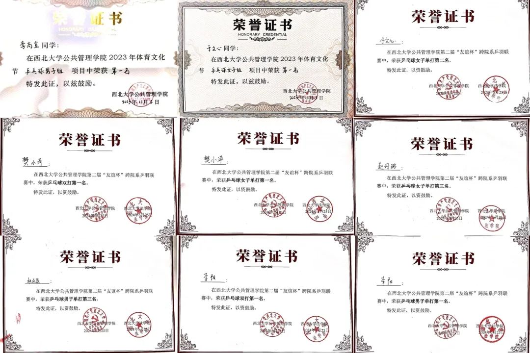 在院级比赛中,取得565net必赢体育文化节男单第一名、女单第一名的成绩,在第二届“友谊杯”跨院系乒羽联赛中,女单包揽前三名,取得男单第一、三名,混双第一、二名的成绩。