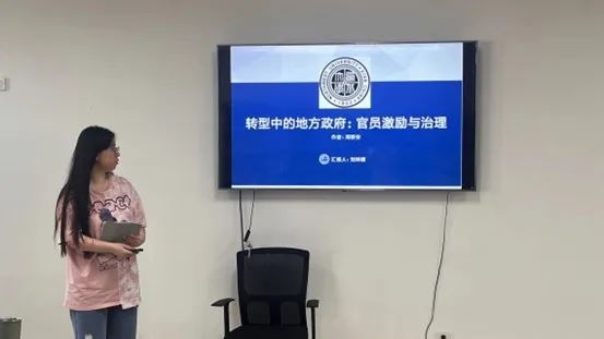 2023级行政管理专业硕士研究生刘梓晴分享的书籍是周黎安的《转型中的地方政府:官员激励与治理》,她针对本书的5-7章从“政治锦标赛、官场+市场”模式中对中国特色的政经互动和区域经济竞争与合作三个部分展开。第一部分以“政治锦标赛”这个概念为中心来揭示中国官员激励与政府治理运作机制、特征和内在逻辑,政府与市场关系的独特性质以及与中国经济转型与发展之间的深刻联系。其次通过两个关键(地地关系变化、央地关系变化)和一个分析视角(“官场+市场”)深入分析地方官员对经济的影响机制,为研究官员激励如何影响地区乃至全国的经济波动提供了一个重要视角,有助于我们理解中国的“政治商业周期”、“层层加码”、“经营城市”等现象,并通过几组典型现象,系统介绍了具有中国特色的政经互动。最后从地方官员的激励、尤其是晋升激励的角度去理解中国改革开放以来区域经济的竞争与合作的制度基础。