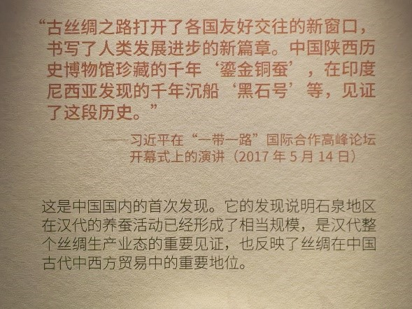 第二展厅内特别设置了关于丝绸之路的展览,展示了秦汉时期与周边国家和地区之间的广泛联系以及由丝绸之路所开启的东西方文化交流盛况。展区内陈列的“丝路一号”、鎏金铜蚕等展品,不仅体现了当时贸易往来的繁荣景象,也反映了中华文明开放包容的精神特质。