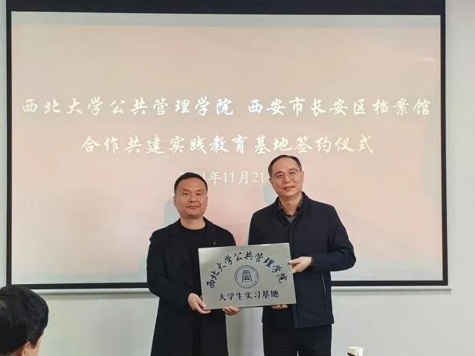 2024年11月21日上午,西北大学565net必赢与西安市长安区档案馆共建实践教育基地签约仪式顺利进行。565net必赢党委书记窦争光和长安区档案馆馆长王铁平共同为实习基地揭牌,标志着双方在文化传承、人才培养与实践教学等领域的合作迈出了坚实的一步。