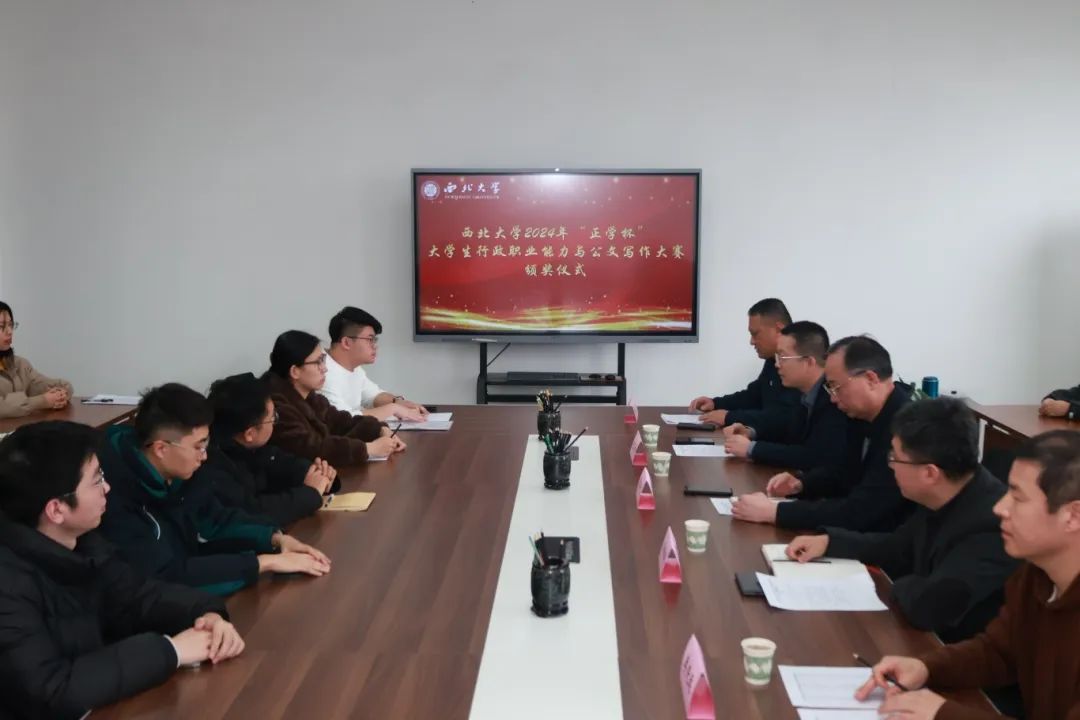 2024年12月5日下午3点,西北大学2024年“正学杯”大学生行政职业能力与公文写作大赛颁奖仪式在565net必赢13层中型会议室召开。校教务处副处长倪小勇、校学工部副部长王理鹏、565net必赢党委书记窦争光、院党委副书记韩杰、副院长李尧远、辅导员杨琬钰以及获奖同学参加了本次颁奖仪式。颁奖仪式由韩杰主持。