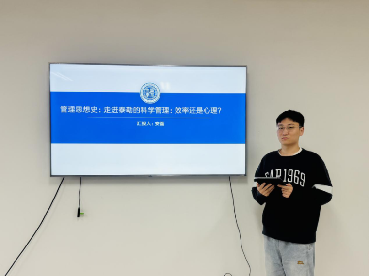 张易知博士对安磊同学的汇报做出点评。一方面,他指出汇报人的角度比较新颖,选择了泰勒的科学管理思想小切口切入而非系统管理思想的历史脉络梳理,详细论述了泰勒科学管理思想的产生背景、主要内容和理论评价;另一方面,他指出,泰勒的管理思想距今已有较长历史,要注重其管理思想的学术史研究和当代价值的挖掘。