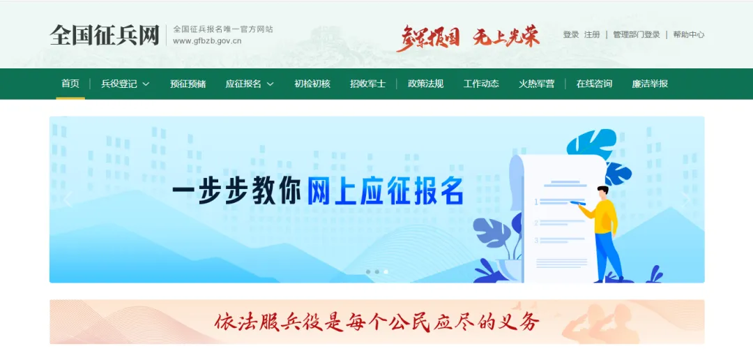 在全国征兵网(https://www.gfbzb.gov.cn/)首页,点击“兵役登记”;