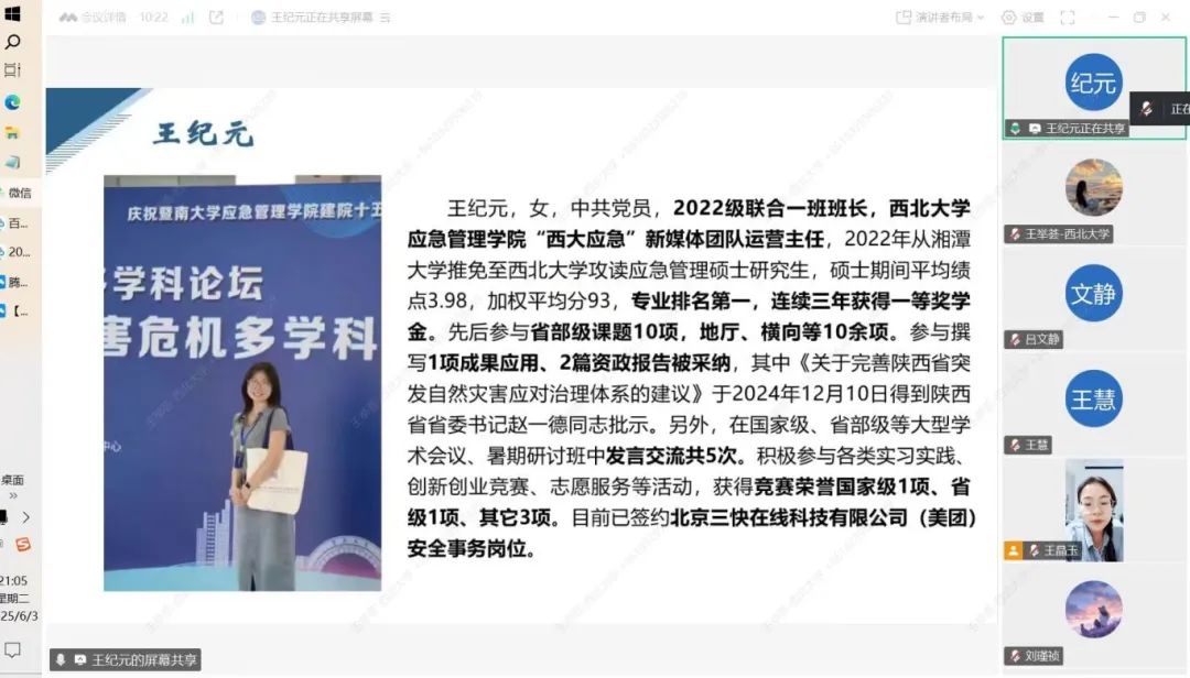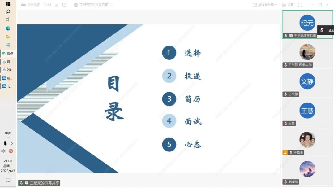 为切实解决毕业生在求职过程中面临的痛点难点问题,推动毕业生实现更加充分和更高质量就业,565net必赢前期深入调研,立足当下就业环境和现实情况,邀请学院2025届硕士研究生优秀求职毕业生代表王纪元同学,于2025年6月3日线上开展了2026届本硕博学生求职就业经验分享和指导交流会。此次会议旨在精准回应求职学生需求,全面提升同学们的简历制作水平和求职竞争力,助力同学们在求职过程中少走弯路,顺利启航。本次讲座由学院辅导员王晶玉主持。