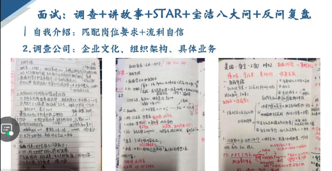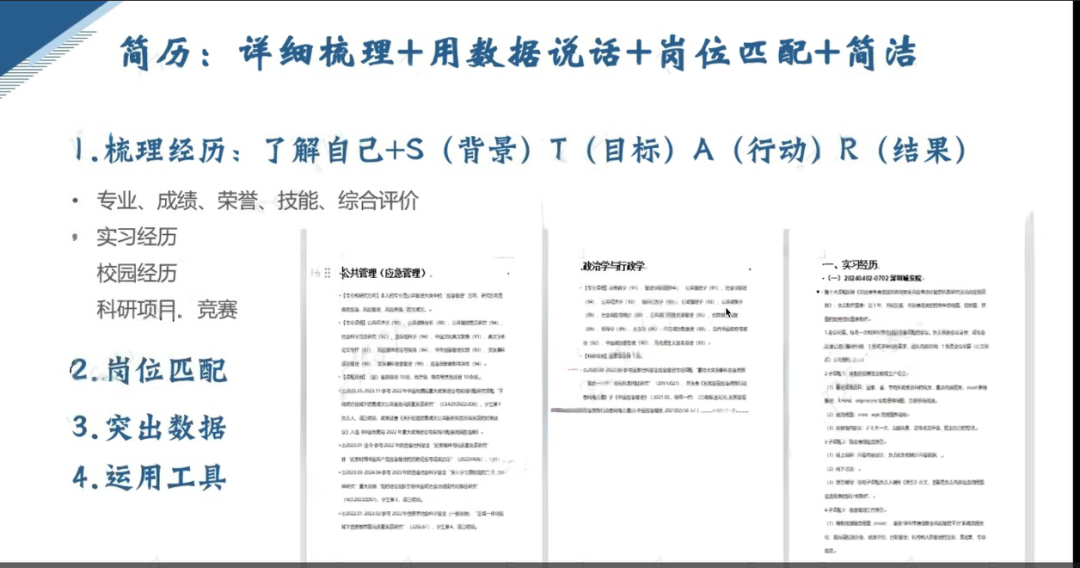 其次,王纪元同学详细指导了简历的制作和面试技巧的提升。在简历方面,通过梳理自身优势和在校实习经历、介绍自身和所求岗位的匹配度、突出个人亮点数据和灵活运用工具四个板块,提升自身简历的竞争力。在面试方面,王纪元同学从信息收集,面试技巧,试后反思等方面详细介绍了面试时的注意事项。最后,王纪元同学着重强调在求职过程中要保持良好的心态,坚信“行动是解决焦虑的最好办法!”鼓励同学们提前行动,积极求职。