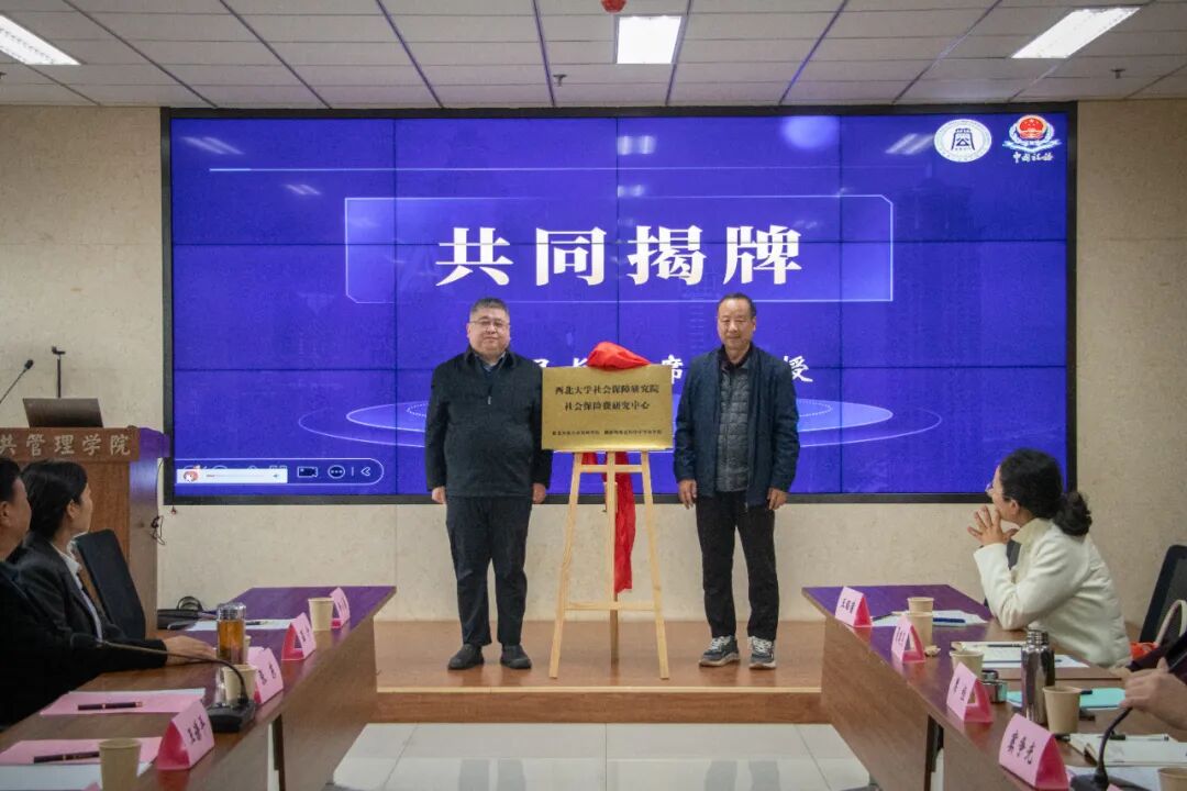揭牌仪式迎来重要时刻。在全体嘉宾的共同见证下,张东局长与席恒教授共同为“西北大学社会保障研究院社会保险费研究中心”揭牌,标志着该研究中心正式成立。随后,双方领导与参会嘉宾合影留念,记录这一具有里程碑意义的时刻。仪式最后,窦争光书记作总结发言,宣布揭牌仪式圆满结束。