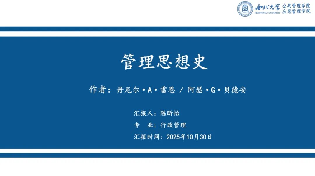 2024级行政管理专业硕士研究生陈昕怡分享的书籍是丹尼尔·A・雷恩与阿瑟・G・贝德安所著的《管理思想史》。汇报人顺着时间轴串联起从18世纪末到现代的管理思想演变,每个阶段都先铺垫时代背景,再介绍代表性学者及其理论,让我们了解到,任何管理理论都有其时代的合理性与局限性。通览全书,《管理思想史》是一部在“效率”与“人性”、“理性”与“非理性”、“控制”与“激励”之间不断摇摆、辩证发展的历史,启发我们思考管理“从何而来”以及“为何如此”。本次分享脉络清晰,从文化和历史视角梳理西方管理思想的发展历程,展现其与经济、社会和政治环境的关联。