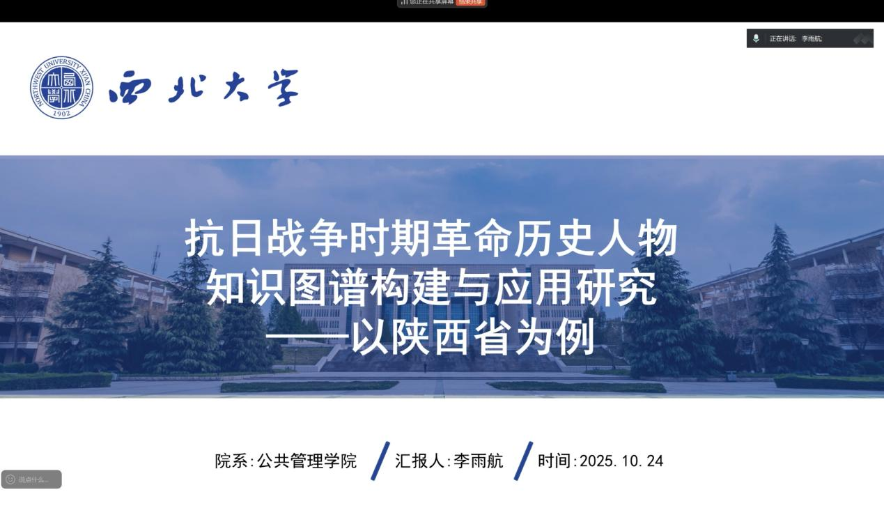 2023级图书馆学硕士研究生李雨航的汇报题目为《抗日战争时期革命历史人物知识图谱构建与应用研究——以陕西省为例》,他主要从研究背景、研究思路与框架、研究内容和研究总结与不足四个方面展开。在研究背景中分析当前红色文献资源以及历史人物研究的现状和不足,提出研究对象和研究目的。在研究思路与框架部分,具体研究实现分为本体模型构建、数据获取、知识图谱构建和图谱应用四方面。在研究内容部分,从类层次设计、属性定义、本体实现和本体评估角度对抗日战争时期革命历史人物本体模型进行阐述;爬取陕西省地方志中人物志中的人物信息,并以此进行命名实体识别和关系抽取处理,使用Neo4j图数据库完成知识图谱的构建;构建了知识图谱可视化系统,实现可视化展示、知识检索和路径发现等功能,最后进行总结并说明知识问答功能未实现等不足。