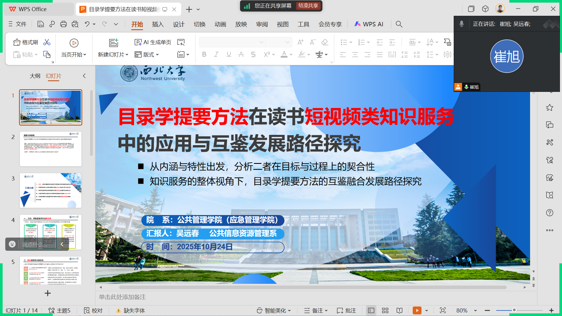 2024级图书馆学硕士研究生吴远春以《目录学提要方法在读书短视频类知识服务中的应用与互鉴发展路径探究》为题开展汇报。