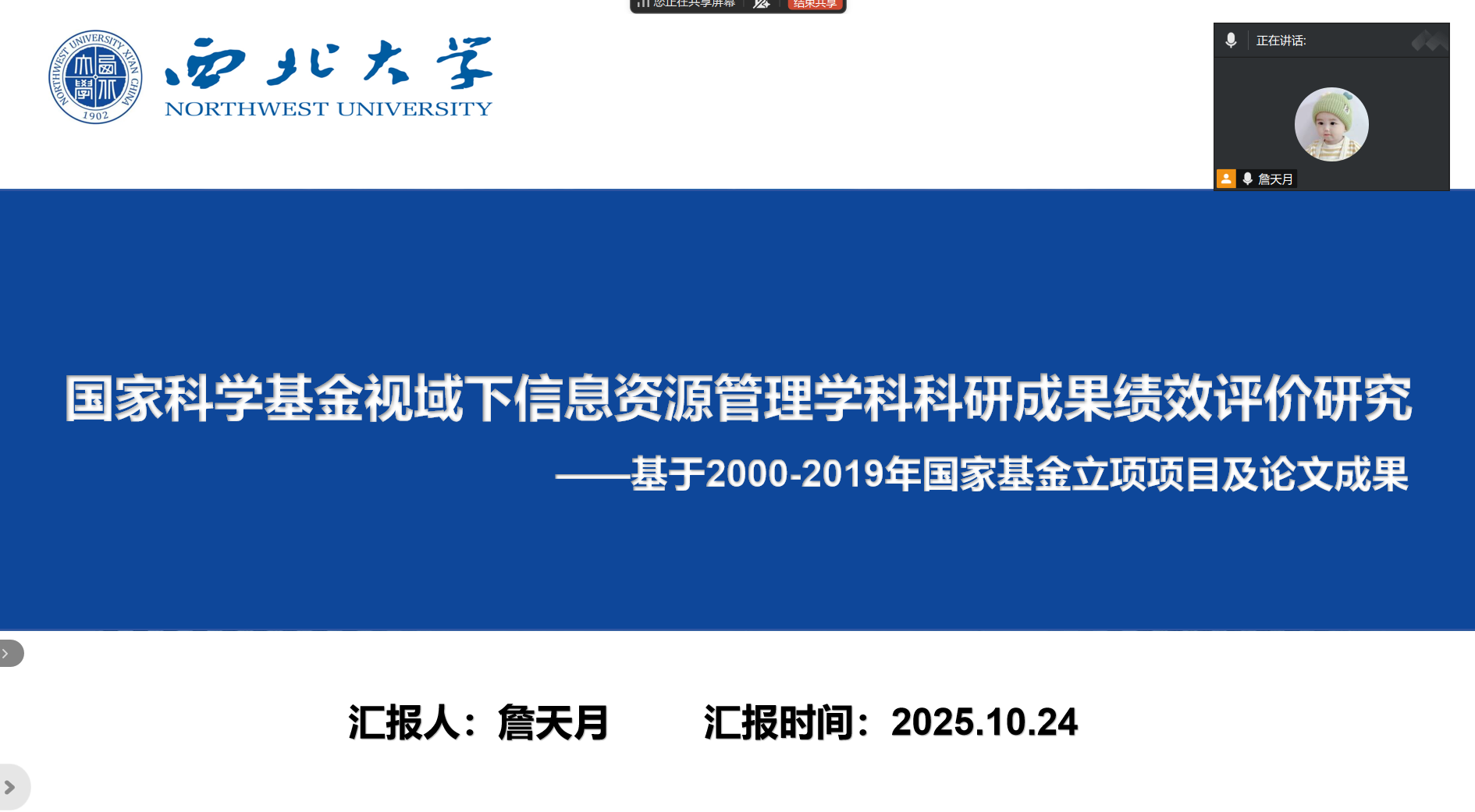 2024级档案学专业硕士研究生詹天月同学的汇报题目是《国家科学基金视域下信息资源管理学科科研成果绩效评价研究》。她主要围绕研究背景及意义、研究内容、数据来源、项目立项情况分析、绩效评价指标分析以及研究结论六个方面展开讲述。首先,她提出本文对国家科学基金下信息资源管理学科的科研成果进行绩效评价研究,对信息资源管理学科的人才培养、资源分配具有重要意义。接着她对研究内容进行简单介绍,本文是基于2000-2019年国家自然科学基金和国家社会科学基金信息资源管理学科领域下的立项项目及论文成果,构建了包括科研产出效率、创新能力以及学术影响力三个维度的绩效评价指标体系,对信息资源管理学科的科研成果进行系统分析和评价。通过分析多视角的绩效评价指标揭示该学科在国家科学基金支持下的科研成果绩效特征及演变趋势。最后,根据统计分析、TF-IDF算法等进行实证分析并得出相关结论,在此基础上提出应加强人才培养、优化资源配置、促进国际合作等建议。