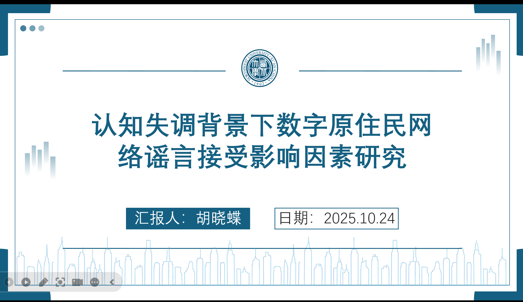 胡晓蝶汇报题为《认知失调背景下数字原住民网络谣言接受影响因素研究》,从数字原住民的认知特征出发,探讨其在面对网络谣言时的接受机制及心理动因。研究指出,数字原住民虽然具备较高的信息素养与网络熟练度,但因价值观尚未完全稳定、情绪易受外界刺激影响等特点,更容易陷入认知失调状态,导致对网络谣言的误信与传播。课题采用扎根理论研究方法,以18名高校在校生为研究对象,通过深度访谈与开放式编码,构建出数字原住民网络谣言接受影响因素模型。研究结果揭示,谣言接受受到认知经验、情绪唤醒、社会信任与涉入程度等多因素的交互作用。最后,报告提出了从教育干预、信息发布规范、社会认知引导等多方面入手的治理建议,以期为提升数字原住民的谣言识别与信息判断能力提供理论参考和实践启示。