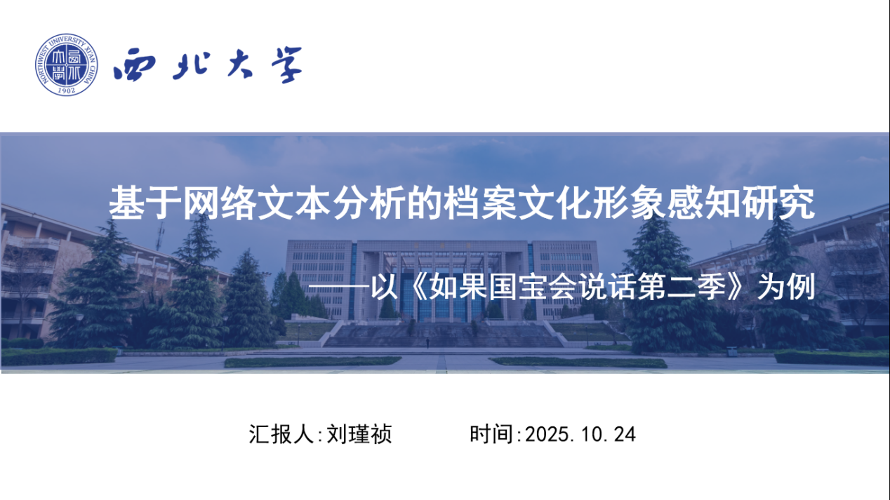 2023级档案学硕士研究生刘瑾祯的汇报题目为《基于网络文本分析的档案文化形象感知研究 ——以《如果国宝会说话第二季》为例》,她分别从研究背景及目的、研究设计、数据分析、研究结论及建议四个方面展开论述。阐述了以豆瓣电影网《如果国宝会说话第二季》的公众评论为样本,利用八爪鱼采集器爬取包括公众名称、评价内容、IP属地、评论时间、感受以及总体评分的数据样本,通过数据处理和清洗,借助ROST Content Mining 6.0文本挖掘软件对《如果国宝会说话第二季》的评论进行数据分析,从高频词分析、语义网络分析和情感分析三方面对非结构化语料进行可视化呈现。明确了传播内容的独特性及紧扣多元文化需求的重要性,提出聚焦内容创新、注重技术融合、加强跨领域协作等建议,以期为档案文化事业的可持续发展提供参考。