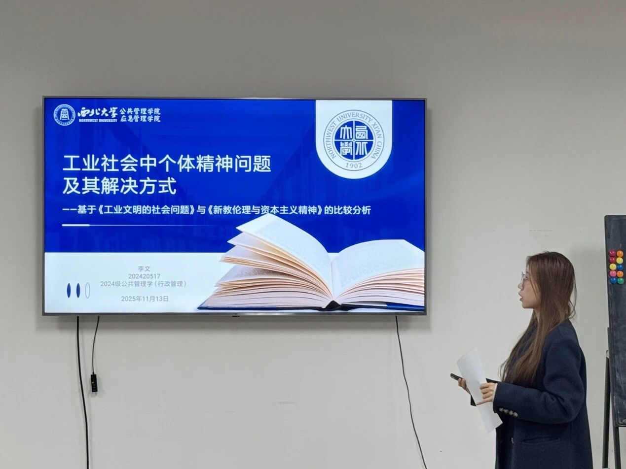2024级行政管理专业硕士研究生李文分享的书籍是乔治·埃尔顿·梅奥的《工业文明的社会问题》。本次分享总体围绕工业社会中个体精神问题及解决方式展开。资本主义工业化在带来社会转型与物质富足的同时,也导致传统秩序崩塌、新秩序未能完善,由此引发个体精神空虚与迷茫;此外,“劳动异化”还导致了工人生产效率下滑、缺勤与转业现象增多等问题。对此,韦伯与梅奥提出了不同解决路径:韦伯在《新教伦理与资本主义精神》中,以“入世禁欲”、“天职观”和“预定论”为核心,让新教徒将劳动视为救赎手段,用超验宗教目标缓解精神困扰,适用于信仰共同体;梅奥基于霍桑实验及现场案例,在《工业文明的社会问题》中提出人际关系学说,强调建立合作体系、培育群体认同,兼顾工人技术与人际交往能力,适用于世俗工厂。二者形成“意义—合作”双轴互补模型,启示组织需在战略上塑造“世俗天职”赋予劳动价值,操作上建设“合作社群”修复人际裂痕,数字化时代更要重视社会技能培养,避免陷入“高转业—低士气”困境,进而实现个体精神状态与组织效率的良性循环。