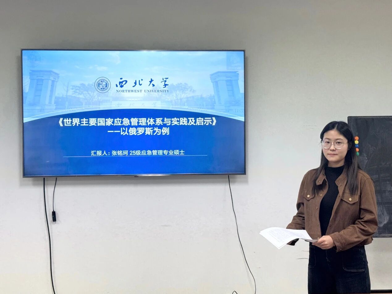 2025级应急管理专业硕士研究生张铭珂分享的书籍是赵来军、霍良安的《世界主要国家应急管理体系与实践及启示》。她主要从研究背景、核心内容、国际比较、本土启示、反思与展望五个部分展开。首先,她从研究背景入手,指出应急管理是国家治理体系和治理能力的重要组成部分,研究国际经验对完善我国应急管理体系意义重大。其次,她梳理了该书的核心内容,以横跨欧亚大陆的大国俄罗斯为重点案例,详细阐述其“宪法引领、专项立法核心、层级分明”的应急管理法制体系,“国防动员与应急管理一体化”的管理体制与运行机制,以及专业化、重型化的应急资源配置与队伍建设特色,并对比我国“统一领导、分级负责、属地为主”的应急管理体制及“社会协同”优势,提炼出两国“法治引领、统筹协调、科技赋能”的共通经验。最后,她结合我国国情,提出从俄罗斯实践中获得的强化核心机构统筹协调能力、加强应急管理与国防动员衔接、提升应急救援队伍职业化水平等启示,同时强调应急管理体系需立足本国国情、吸收国际经验构建,并指出应急管理体系没有“标准答案”,只有“适配方案”。