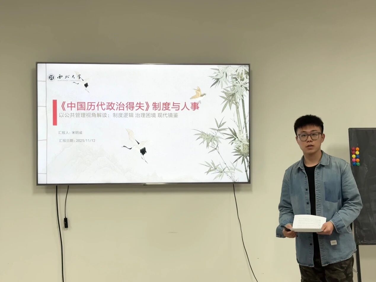 2025级行政管理专业硕士研究生宋明威分享的书籍是国学大师钱穆先生的经典著作《中国历代政治得失》。他从独特视角、必读价值、议题关联、重要观点和指导意义五个维度,深入剖析了这部作品对公共行政专业的深远影响。首先,他从独特视角切入,指出钱穆先生通过梳理汉、唐、宋、明、清五个主要朝代的政治制度,跳出了传统史学“王朝循环”的片面认知框架,并向大家介绍了钱穆先生聚焦于制度设计的历史惯性与利弊共生视角,揭示了任何制度都不是孤立存在的,而是在历史长河中不断演变、适应与调整的结果。在必读价值方面,他认为《中国历代政治得失》对传统公共行政或行政管理专业而言是必读书目,能为理解中国特色治理逻辑提供关键视角,帮助我们建立对中国政治传统的系统性认知,从而更好地把握当下行政体系的深层结构。在议题关联方面,他详细分析了书中呈现的央地关系、君权相权制衡、选官制度变迁等经典议题,如中央与地方权责划分、行政权力制衡机制、公务员选拔制度等,认为这些议题与当代公共行政前沿现实议题一脉相承。此外,他特别引用了钱穆先生“制度需适配国情、体察民情”的核心观点,具体来说就是若脱离历史传统与地域特色,制度设计便如同无根之木,难以真正落地生根。这一深刻洞见对当前中国行政体制改革具有重要启示——任何制度移植都需优先考量本土适应性,避免简单照搬西方模式。最后,他总结了该书的指导意义,认为《中国历代政治得失》对公共行政学习中的制度问题及设计具有重要的指导意义,启发我们在制度建设中既要借鉴历史经验,又要立足当下实际,在传统与现代之间寻找平衡点,构建既有历史底蕴又符合时代需求的行政体系。宋明威同学的分享为我们理解中国行政制度的演进逻辑提供了全新视角,也为思考当代公共行政问题提供了宝贵的历史镜鉴。