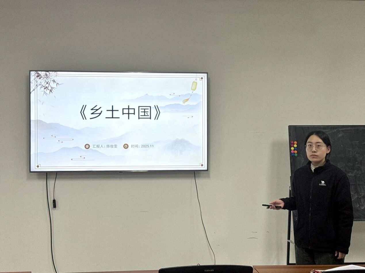 2025级社会保障专业硕士研究生陈俊雯分享的书籍是费孝通的《乡土中国》。她主要从书籍简介、分享理由、核心内容、体会心得四个方面展开。首先,她指出该书并非具体描述中国乡村的风土人情,而是从宏观角度提炼传统中国基层社会的深层结构和运行逻辑。费孝通在书中写道,中国传统社会是扎根于土地的,人们聚村而居,生活安定,彼此熟悉,形成了一个“熟人社会”。其次,她指出这种社会具有稳定性、不流动性和地方性的特点。她强调,“差序格局”是全书最核心、最著名的概念,费孝通用这个概念来概括中国社会的基本结构。她接着谈到“礼治秩序”与“无为政治”:在“熟人社会”中,社会秩序主要不是依靠国家法律来维持,而是依靠长期积淀下来的传统、习俗和礼仪。人们通过教化内化这些规范,从而主动服从。与之相应的政治模式是“长老统治”式的“无为而治”,由享有威望的长者依据传统来调解纠纷,维持稳定。最后,她根据费孝通先生对现实问题的分析,指出书中用核心概念分析了诸如“男女有别”、“家族”、“无讼”等现象,并通过对“文字下乡”的讨论,指出在静止的乡土社会中,面对面的直接交流远比文字更为有效,揭示了文化形式与社会结构的内在联系。