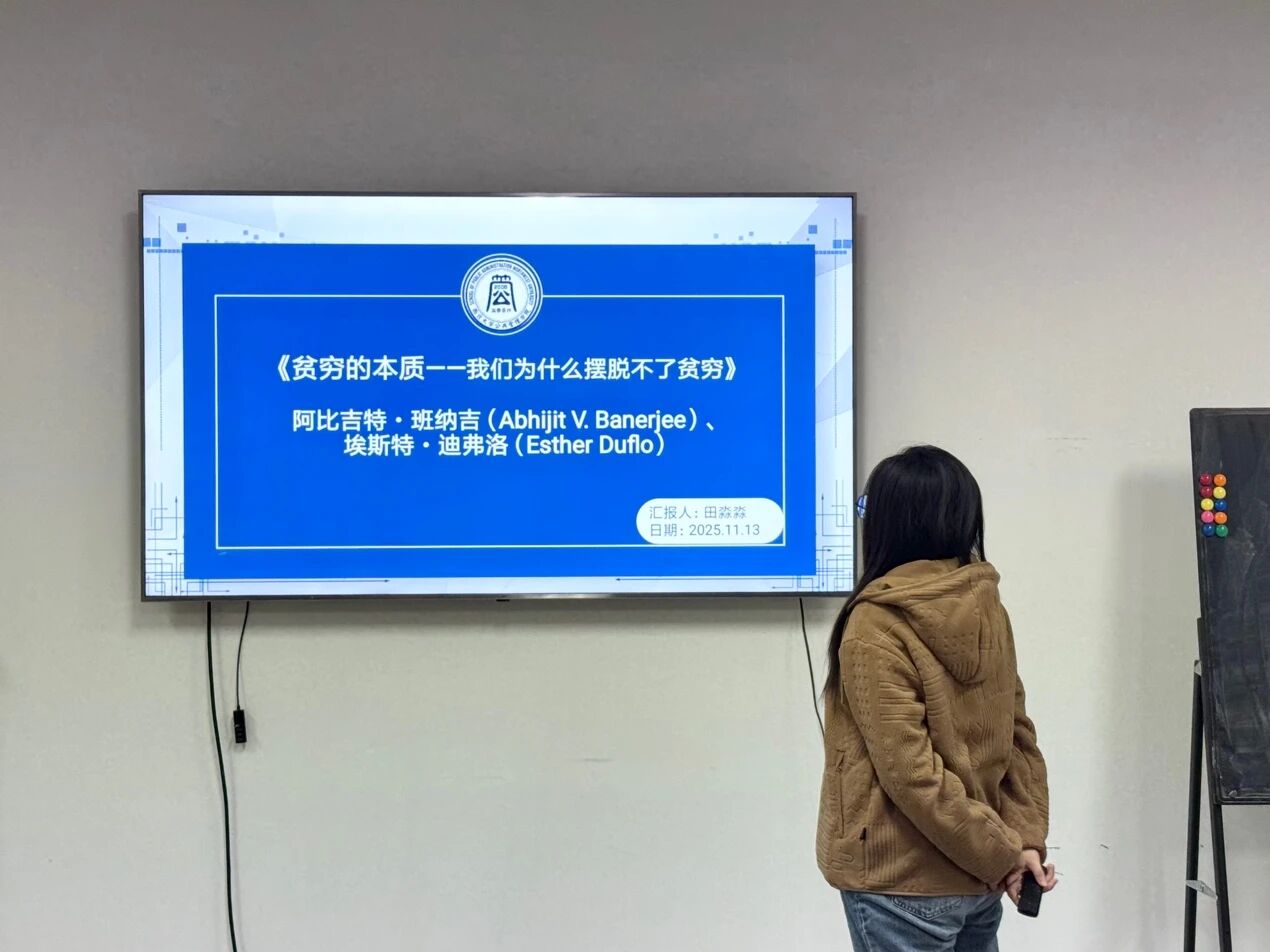 2024级社会保障专业硕士研究生田淼淼同学分享的书籍是阿比吉特·班纳吉、埃斯特·迪佛洛的《贫穷的本质:我们为什么摆脱不了贫穷》。汇报中,田淼淼同学首先介绍了书籍核心背景,两位作者耗时十五年深入五大洲贫困地区,聚焦每日收入0.99美元以下的赤贫家庭,打破“援助越多越依赖”等传统认知,通过研究剖析穷人陷入贫困陷阱的深层逻辑。田淼淼同学系统梳理了书籍框架,从穷人家庭生活选择、市场机构服务效能、个体决策困境三大维度,解读贫困在教育、健康、创业等领域的具体表现。