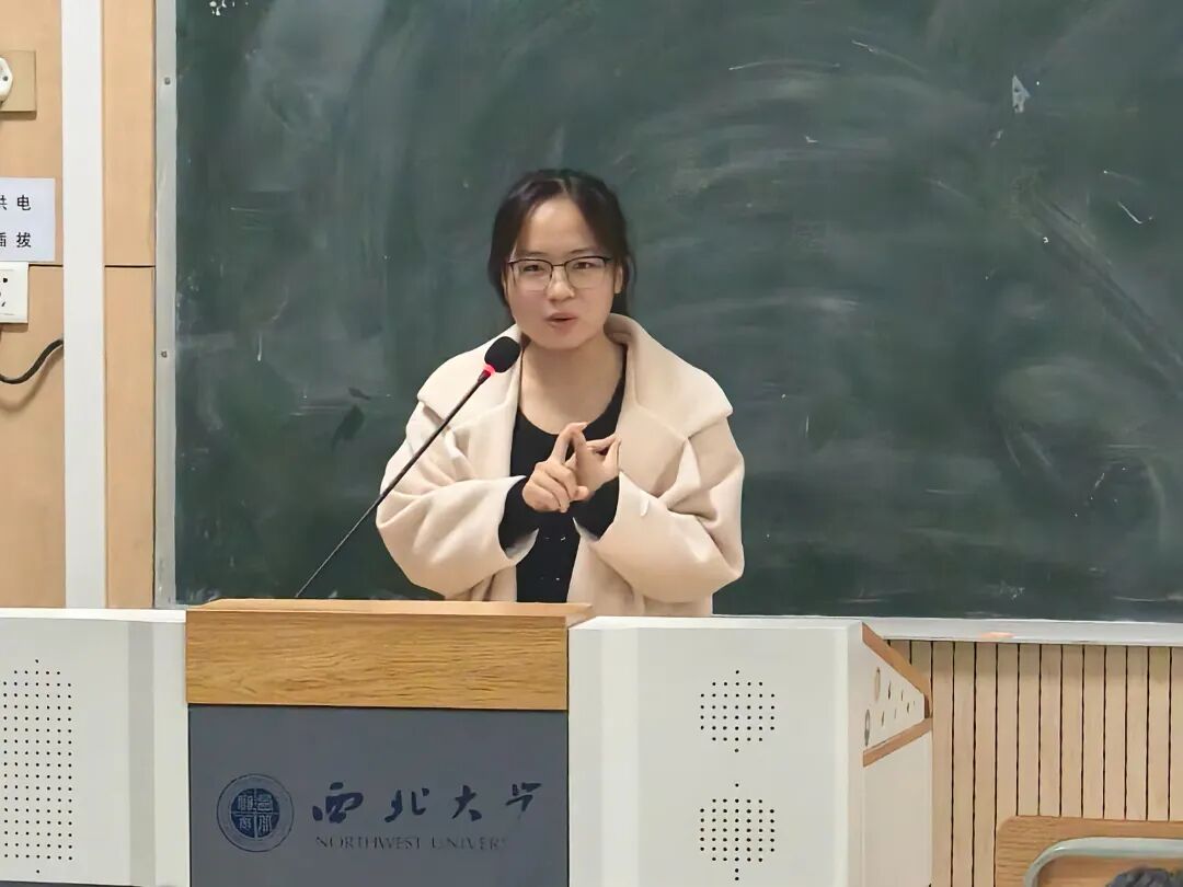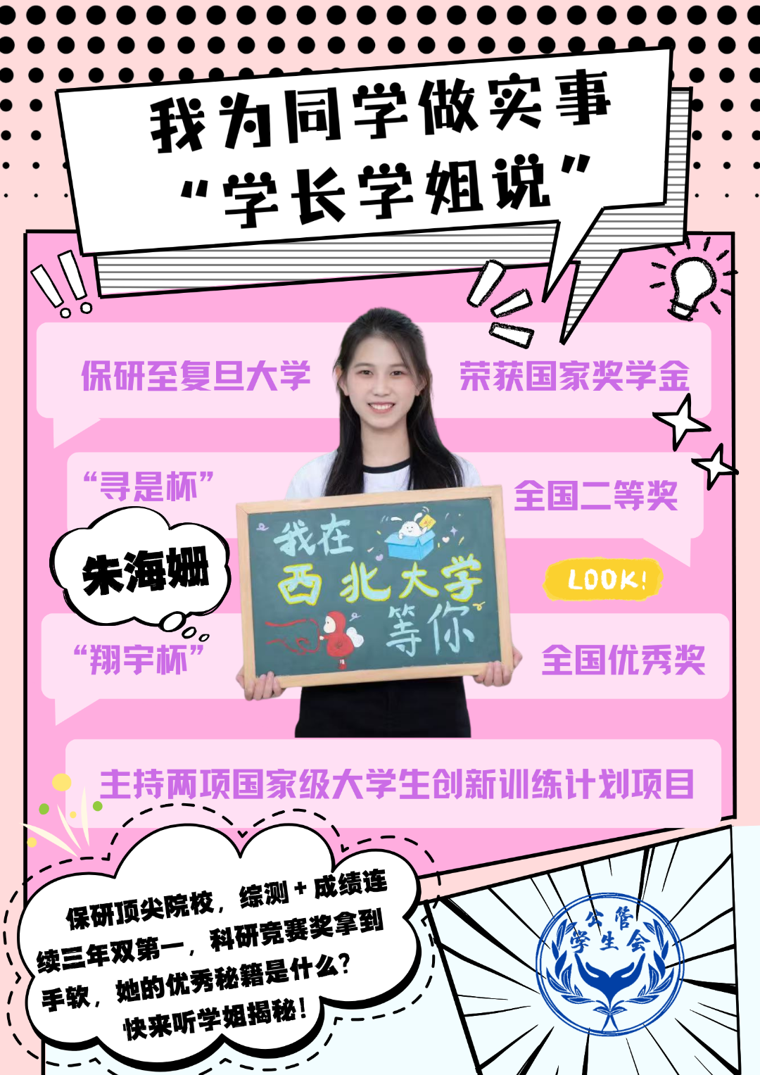 朱海姗围绕学业规划、能力提升、成长心态三个方面展开分享。首先,她提出要锚定目标,确定发展方向,专一事,做一职。其次要做到专业深耕,以赛促学,夯实专业基础,要勇敢与老师交流、主动获取资源,完善科研经历。勇敢去尝试探索,参加社会实践活动与志愿服务,大声去表达,坚定去追求,制定规划,步步前行。最后,朱海姗真诚送上寄语:勇敢走出舒适圈,身体健康最重要,尽人事,听天命。