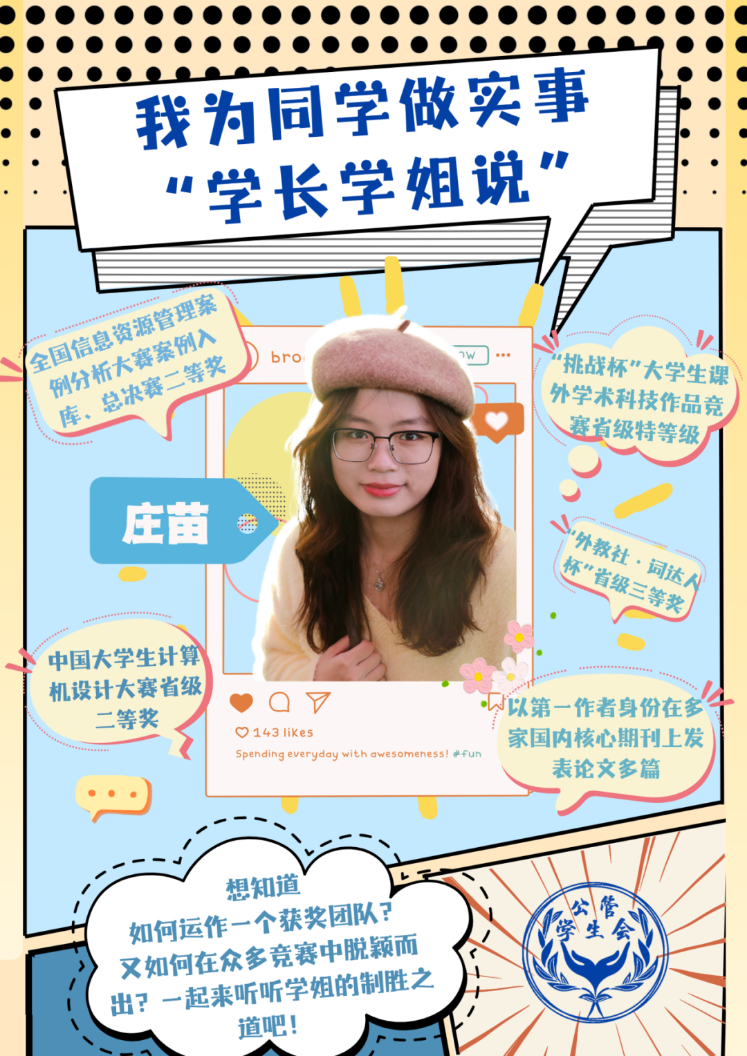 推免远航,逐梦学术,是深耕专业领域、迈向更高学府的优质选择,更是锤炼科研素养、积淀学术能力、开拓未来赛道的关键征程。本次“学长学姐说”朋辈互助活动邀请到2022级图书馆学专业本科生庄苗、2022级图书馆学专业本科生张宇迪、2022级行政管理专业本科生朱海姗、2022级管理科学专业本科生王咏楠为2025级本科生新生带来干货满满的推免备战指南。针对新生在推免初期常见的方向迷茫、准备盲区等问题,学姐学长们精准施策,分享了涵盖学业提升、科研实践、材料筹备的全流程规划方案,不仅帮新生理清了推免核心脉络,更明确了大学四年的成长节奏。这场实用的经验分享,为2025级本科生新生点亮了推免深造的前行灯塔,让学术进阶之路每一步都走得坚定且有力。