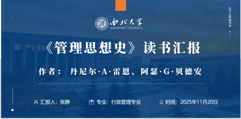 2024级行政管理专业硕士研究生张静分享的书籍是丹尼尔·A·雷恩与阿瑟·G·贝德安所著的《管理思想史》。她从内容简介、写作思路、底层逻辑、研究启示、反思与展望等五个方面展开。第一,她对书籍及作者进行了详细介绍,指出这本书通过丰富的实践案例实现了理论与现实的深度衔接。第二,介绍了不同时代管理思想的代表性理论观点。第三,揭示了管理思想演变的底层逻辑,即技术驱动、人性认知深化、全球化与多元化。第四,总结了管理思想发展的核心启示,即坚持问题导向、人本思想和跨学科融合的研究方法。第五,提出了自己对本书的思考,认为在人工智能的浪潮下,管理实践将更注重创造力培养、人机协作与组织韧性建设。
