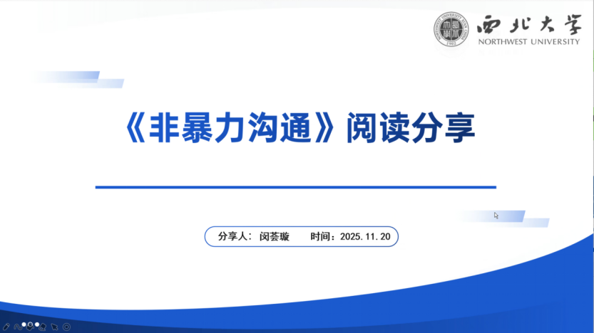 2024级信息资源管理专业硕士研究生闵荟璇分享的书籍是马歇尔·卢森堡的《非暴力沟通》。她的分享主要围绕书中内容展开,包括书籍简介,非暴力沟通的四个核心要素,实际生活中的应用案例,以及非暴力沟通的挑战与应对。首先她通过介绍作者马歇尔·卢森堡经历引入非暴力沟通,指出非暴力沟通的核心要素及其必要性。其次,她详细描述了非暴力沟通的四个核心要素:观察、感受、需要和请求,并谈了如何正确理解并在生活中应用。最后,她指出在进行非暴力沟通时遇到的一些挑战,并提出一些注意事项和应对措施,避免错误使用给自己带来困扰。