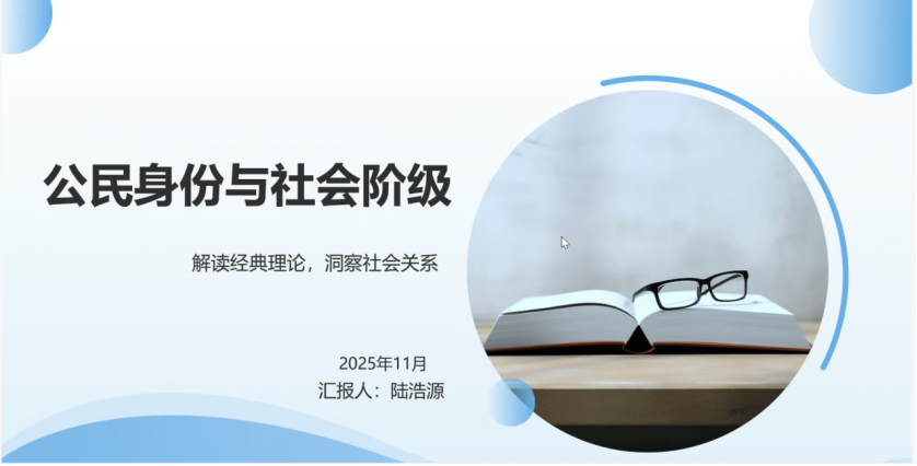 2025级社会保障专业硕士研究生陆浩源分享的书籍是T.H马歇尔、安东尼·吉登斯等学者所著的《公民身份与社会阶级》。本次分享围绕书籍概况、核心理论、主要观点、学术拓展及争议焦点五个维度展开,结构清晰、重点突出。陆浩源同学重点解析了马歇尔提出的公民身份三重要素——18世纪趋于成熟的公民权利、19世纪逐步兴起的政治权利,以及20世纪成为核心议题的社会权利,并系统阐释了公民身份“地域融合”与“功能分化”的发展规律。分享聚焦公民身份所蕴含的“平等原则”与社会阶级自带的“不平等原则”之间的内在张力,梳理了二者从历史维度的暂时妥协,到20世纪社会权利崛起后逐渐走向张力激化的演变脉络。同时,陆浩源还介绍了吉登斯、鲍曼等学者对该理论的后续拓展,并客观呈现了该理论存在的以英国为分析中心的局限、性别视角缺失等争议点,展现了对著作的全面理解。