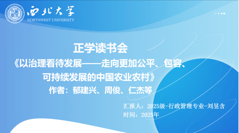 2025级行政管理专业硕士研究生刘昱含分享的书籍是郁建兴、周俊等人所著的《以治理看待发展——走向更加公平、包容、可持续发展的中国农业农村》一书。首先,她介绍了书籍作者以及从学术、实践以及个人成长三个维度选择这本书的原因。其次,她引用书中的观点——“农业农村的发展不是单向的‘治理推动发展’,而是治理与发展相互依存、动态调试的整体性过程。”并指出良好的治理是农业农村实现公平、包容与可持续发展的前提,而发展的需求又反过来倒逼治理体系的优化。随后,她选取书中写到的作为基本政治制度的村民自治这一部分内容,从村民自治这一切口分析治理和发展的关系。并由此分享了治理是发展的核心驱动力、制度安排比“资源投入”更重要、“三治结合”是中国特色路径、治理需要动态调整四条关键结论。接着,她结合书中观点,分享了当前中国农业农村发展有几点重要启示。一是重点关注“治理的整体性变革”;二是深化“三治结合”的多元路径;三是警惕“形式主义治理”。最后,她分享了个人感悟:研究农村问题或参与乡村振兴,不能只关注“做了什么”,更要追问“如何做”“谁来做”“效果如何”——这才是公共管理者的价值所在。