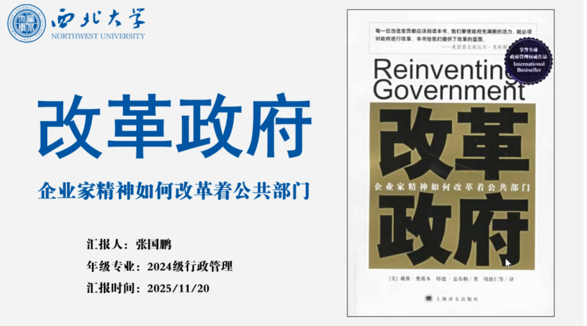 2024级行政管理专业硕士研究生张国鹏分享的书籍是戴维·奥斯本与特德·盖布勒的经典著作《改革政府:企业家精神如何改革着公共部门》。他围绕该书系统阐述了企业家精神如何推动公共部门改革。首先,他从政府面临的财政、管理和信任危机切入,剖析了传统官僚体制效率低下、响应迟缓等弊端;随后,提出以“企业家精神”重塑公共部门,构建以使命驱动、结果导向、顾客为中心的“企业化政府”,并系统阐述其十条原则与五项战略;其次,通过美国及其他国家的实践案例,说明该理论在提升政府效能与服务满意度方面的成效;最后,他指出该理论在政企差异简化、实践条件依赖等方面的局限,并梳理了后续理论的修正与发展,强调公共性、协同治理与数字治理的重要性。