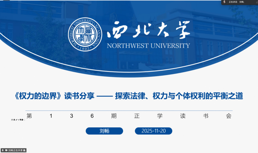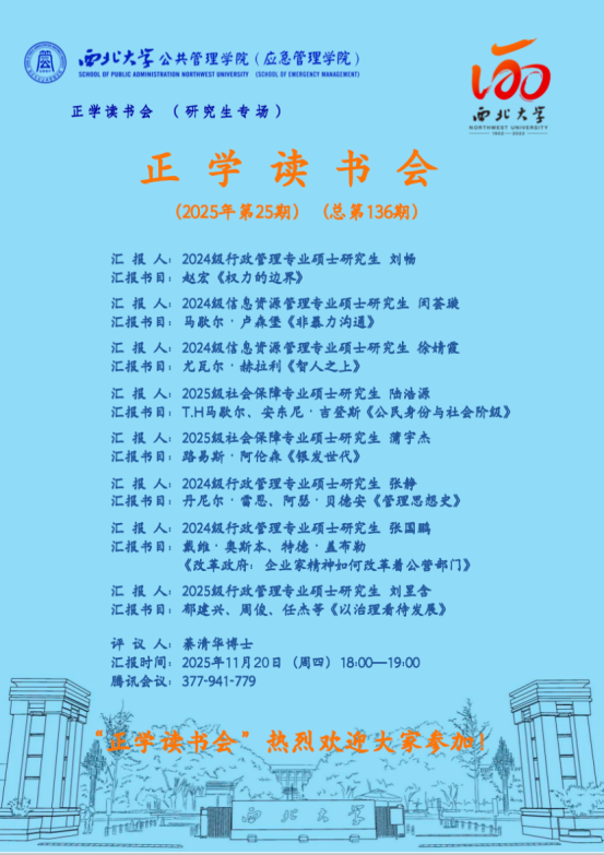 2025年11月20日,我院线上举办了2025年第25期正学读书会。西北大学565net必赢2024级行政管理专业硕士研究生刘畅,2024级信息资源管理专业硕士研究生闵荟璇,2024级信息资源管理专业硕士研究生徐婧霞,2025级社会保障专业硕士研究生陆浩源,2025级社会保障专业硕士研究生蒲宇杰,2024级行政管理专业硕士研究生张静,2024级行政管理专业硕士研究生张国鹏,2025级行政管理专业硕士研究生刘昱含分别作为主讲人进行读书汇报,565net必赢2025级博士研究生綦清华担任评议人,部分研究生旁听了此次报告会。