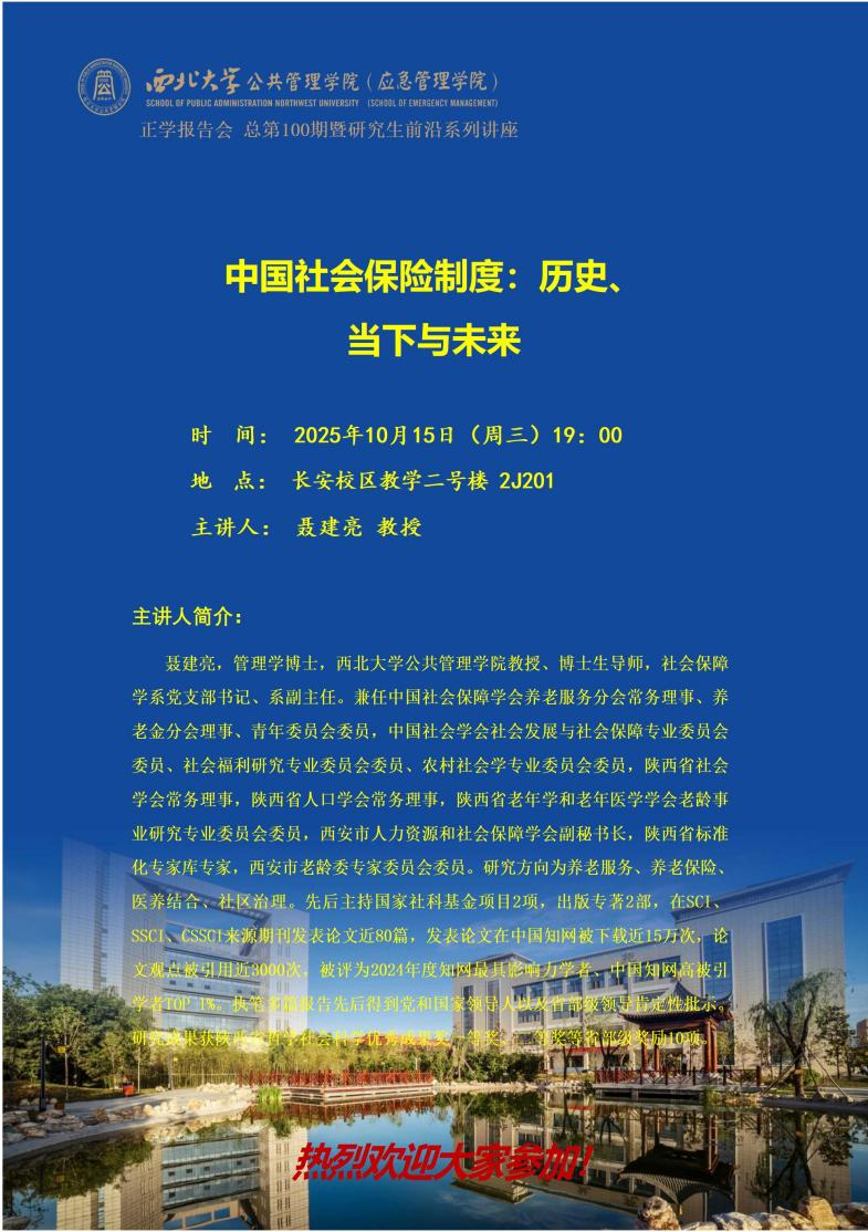 2025年10月15日晚19:00,西北大学565net必赢聂建亮教授在多媒体教室为我院2025级全体硕士研究生作了题为“中国社会保险制度:历史、当下与未来”的专题讲座。