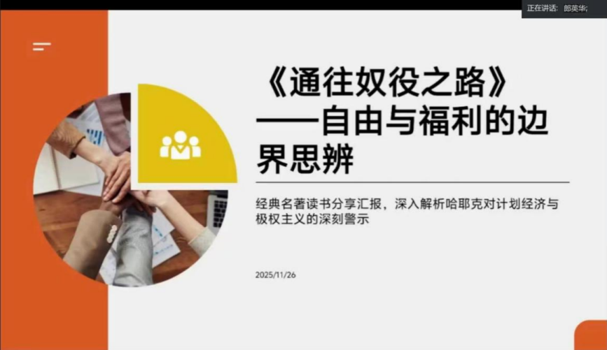 施定涛博士在点评时给予了肯定:“这个PPT精准呈现了哈耶克的核心主张,清晰划分了市场与政府的边界,既融入了对中国发展的理论反思,又饱含对个体尊严与社会进步的人文关怀。”这番评价让大家感受到,经典著作的解读不仅需要扎实的理论功底,更需要现实观照与人文温度。此次汇报对她而言,既是一次对经典思想的再深化,也是一次与同好交流的思想碰撞。未来,相信她仍会持续深耕经典,在理论与现实的对话中,探寻更多关于社会治理与个体自由的智慧。