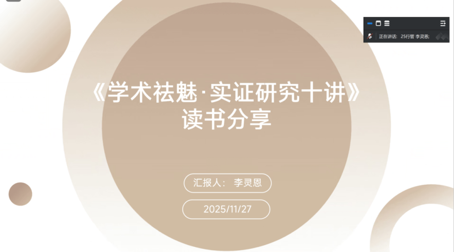 2025级行政管理专业硕士研究生李灵恩分享的书目是马亮的《学术祛魅:实证研究十讲》,为现场读者搭建起实证研究的清晰认知框架。本次分享围绕书籍与作者概览、核心观点透视、实证方法全流程、思维与伦理革新、写作与发表策略五大板块展开。李灵恩首先介绍,该书由人大出版社马亮教授出版,聚焦社科研究中形式与内容脱节的痛点,提出以问题为导向的实证研究新路径,兼具学术深度与实操价值。分享中,她详细拆解了从选题、文献综述、理论构建到实证检验的完整研究流程,通过“基层编制倒挂”等公共管理案例,具象化呈现问卷调查、实验设计等方法在治理难题解析中的应用,同时强调了学术伦理与公共价值关怀的重要性,提醒避免陷入“方法至上”的误区。