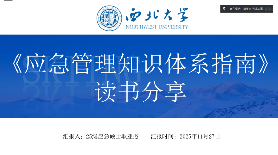 2025级应急管理专业硕士研究生耿亚杰分享的书籍是陈安、夏宝成所著的《应急管理知识体系指南》一书。分享中,耿亚杰同学首先明确了该书作为应急管理“知识地图”的核心定位。该书成书于我国应急管理体系从传统向现代转型的关键阶段,既涵盖基础概念、机理方法,又包含行业应用、案例分析与国际经验,实现了学术性与实用性的统一。随后,她详细拆解了书籍“六编一体”的完整架构,从应急管理基础框架、内容功能、工具方法,到行业领域应急、典型案例分析、国际经验借鉴,层层递进地呈现了应急管理的知识体系全貌。在理论创新解读环节,耿亚杰重点阐述了书中三大核心突破:突发事件机理体系的分层构建、应急管理全生命周期的动态评价、应急管理机制的系统设计,揭示了现代应急管理从“经验判断”走向“科学决策”、从“被动应对”转向“主动预判”的转型逻辑。她还结合自身研究视角,分享了该书带来的学术启示,强调跨学科融合、问题导向研究与国际经验本土化适配的重要性。