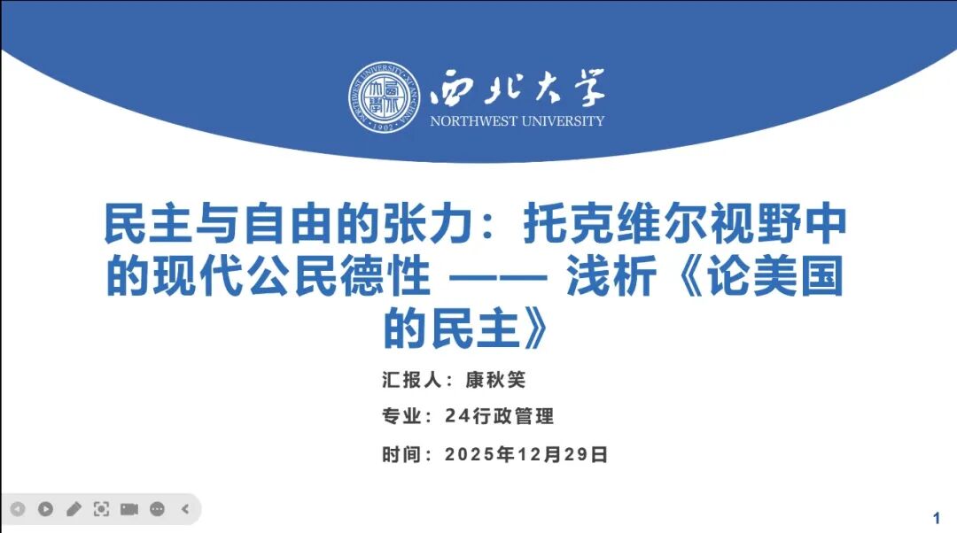 2024级行政管理专业硕士研究生康秋笑以 “民主与自由的张力:托克维尔视野中的现代公民德性” 为题,深度解读经典著作《论美国的民主》。康秋笑同学从作者简介、内容概要、本书贡献及实践启示四方面展开。她介绍,托克维尔作为法国著名政治思想家,其著作围绕 “民主与自由的张力” 核心命题,剖析了美国民主的地理、民情与法制基础,揭示了平等激情的双重效应,预警了中央行政集权风险,并提出公民德性培育的四维路径。该书在理论上突破二元对立思维,将公民德性视为民主 “隐形支柱”,方法上融合实证观察与比较历史分析,为民主研究提供了整合性框架。