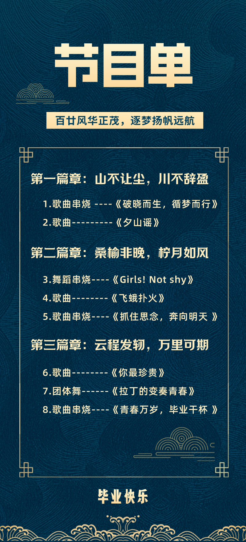 毕业联欢会分为“山不让尘,川不辞盈”“桑榆非晚,柠月如风”“云程发轫,万里可期”三个篇章,一系列歌曲和舞蹈表演,体现了“百廿风华正茂,逐梦扬帆远航”的主题,真诚地表达了对毕业生的美好期望和祝福。