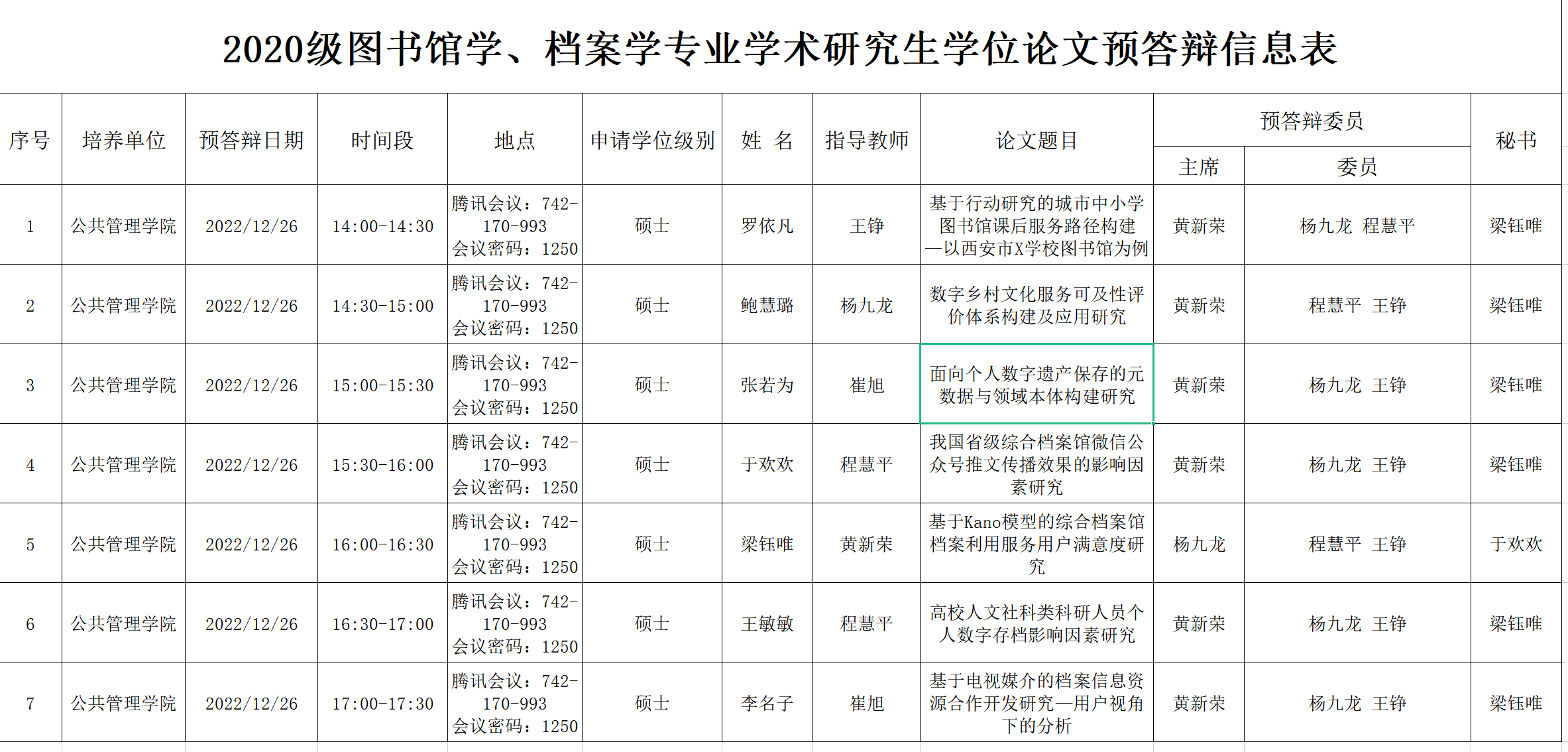 2020级图书馆学、档案学专业学术研究生学位论文预答辩信息表